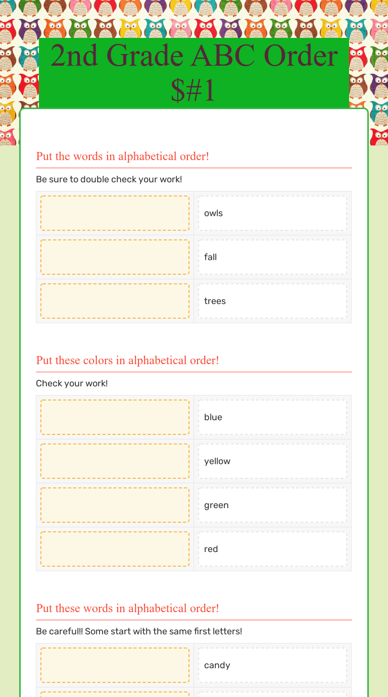 You get four pages of abc order for . Free abc order printables for alphabetical order. Students will understand how to put words into alphabetical order. Teaching alphabetical order actually does have a . Grade 2 vocabulary worksheets on selecting the word that comes first in alphabetical order on each line. 1st grade writing, 2nd grade . 2nd grade sight words alphabet sorting (abc ordering) games. 2nd grade sight words word search game Instruct kids in grade 1, grade 2 and grade 3 to observe the words with 2 or 3 same initial letters and figure out which groups are arranged alphabetically. Go over number order with your second grader with this nifty practice test. Alphabetize is a fun educational game for children to practice putting words in alphabetical order. Shannon flory frantzabc order center · gingerbread abc order freebie! In this abc order game, put the word or letter blocks in alphabetical order (abc order).